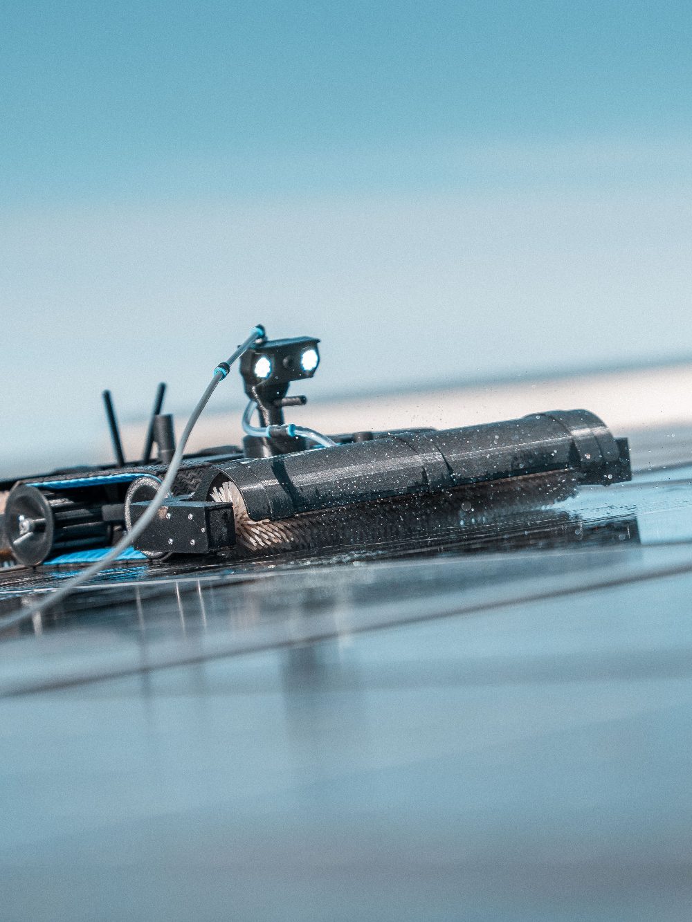 Chez DroneCleanProtect, nous utilisons un robot de nettoyage professionnel spécialement conçu pour l’entretien des centrales photovoltaïques, qu’elles soient installées sur toitures, hangars ou au sol.