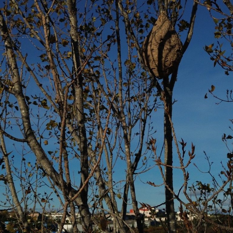 Avec un Corps noir brun avec une fine bande orangée sur l’abdomen, le frelon asiatique construit un nid sphérique, souvent de grande taille (jusqu’à 1 mètre de haut).