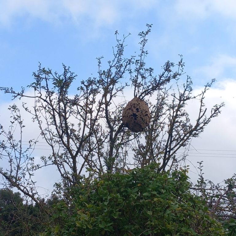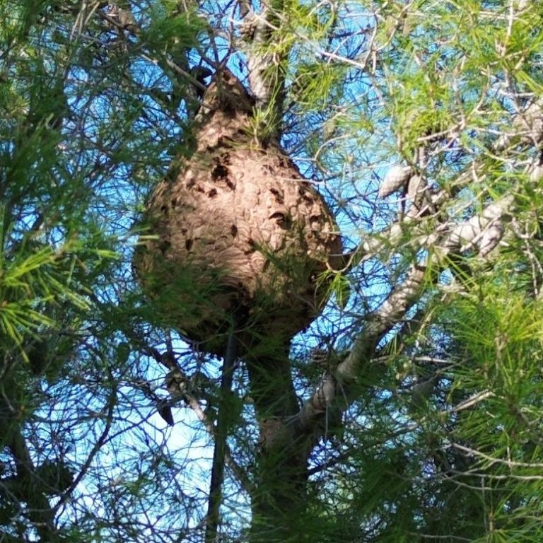 Avec un Corps noir brun avec une fine bande orangée sur l’abdomen, le frelon asiatique construit un nid sphérique, souvent de grande taille (jusqu’à 1 mètre de haut).